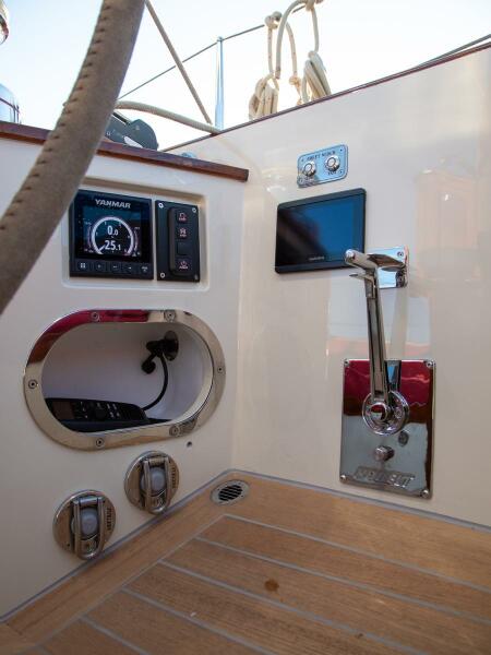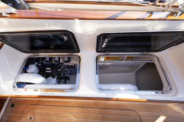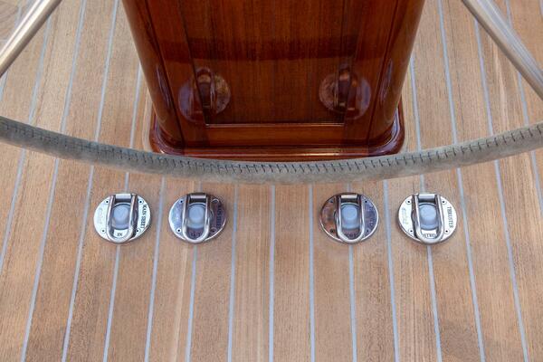 To allow for cruising without cluttering deck operations or the beautiful classic hull lines, there is a stow-away/ swing-out anchor launcher equipped with a gas-spring assist. This keeps all of the equipment below deck in the forward locker while not in use. A Muir electric windlass belowdecks handles the heavy lifting.