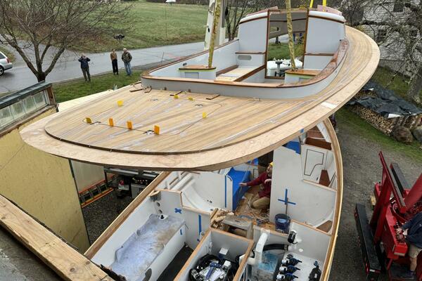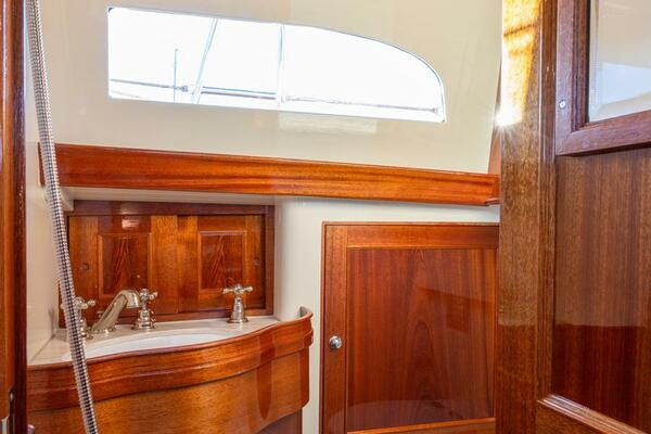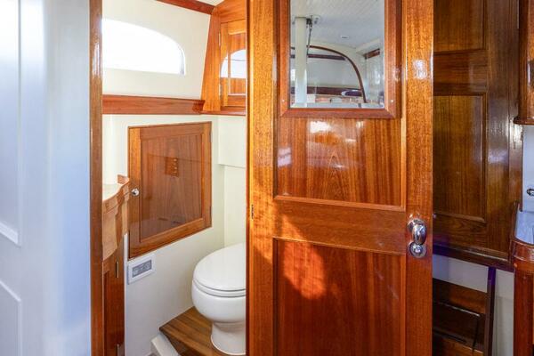 Cold molded construction utilizing Cedar + E-glass & epoxy for the hull, Douglas Fir for the frames. The deck is a composite utilizing a foam core sandwiched with wood & E-glass which enhances structural integrity and rigidity. The superstructure is marine ply + E-glass. Bulkheads are of Okoume marine ply. Floor timbers are integral with laminated frames, floors of Mahogany and Douglas Fir.
