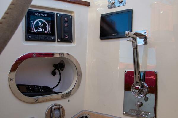Inside, some may be surprised to find standing headroom in both the galley and head, setting the stage for a remarkable daysailing adventure or overnight escape. While packing plenty of performance under sail, she effortlessly transforms into a luxury weekender, featuring saloon seating for four and a queen-size forward berth.