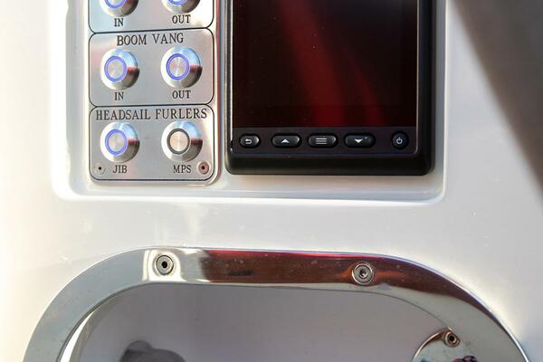 The rig is managed via advanced sailing controls and clever deck hardware solutions including an under-deck mainsheet trim system with a reverse-purchase hydraulic cylinder, oversized Harken electric winches, and an ergonomic boom-furling mainsail system - all operated via push-button controls mounted at the helm position.
