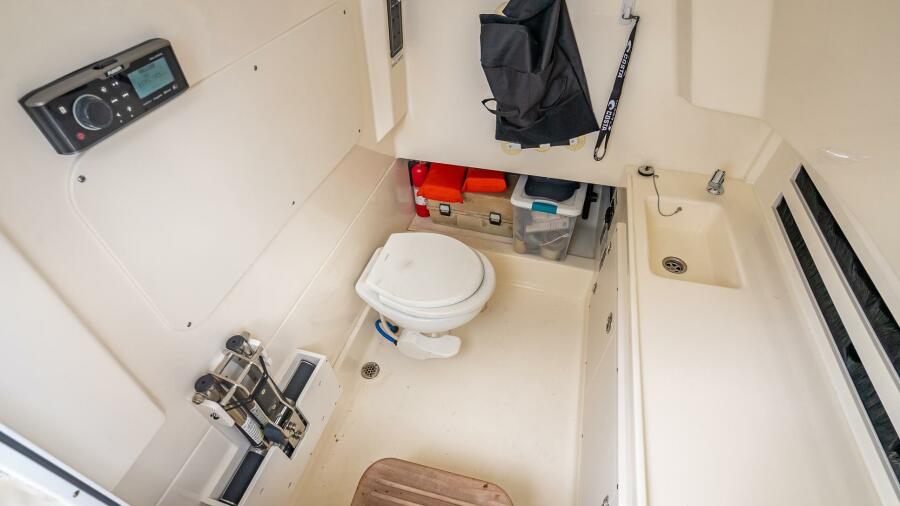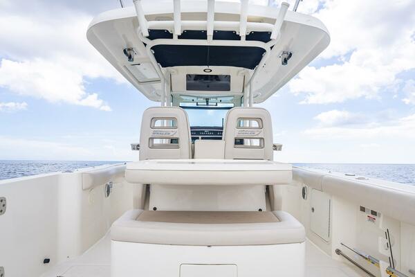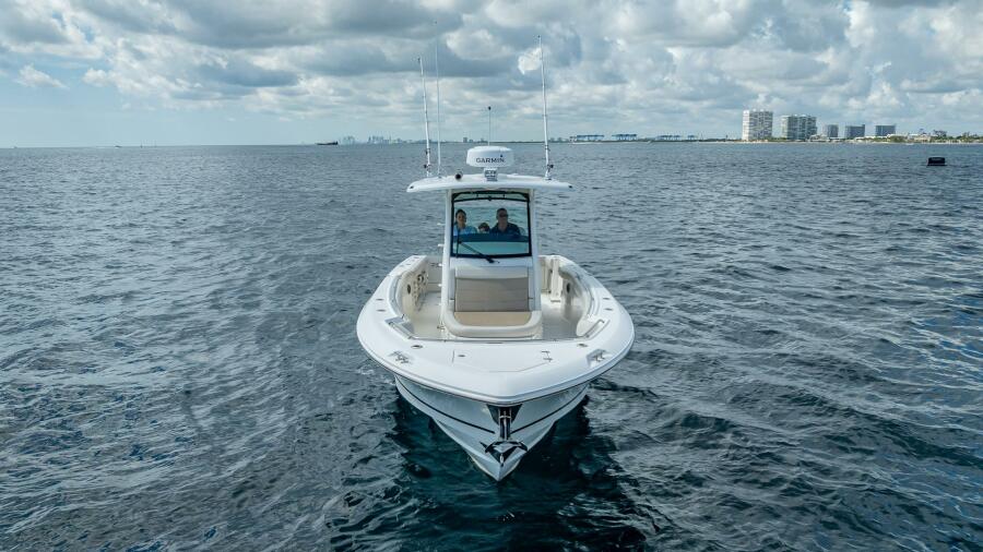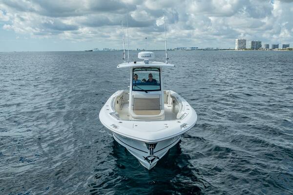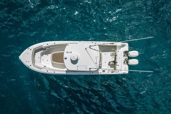 - Freshwater system (40 gallons) with sink in console, transom shower and anchor washdown