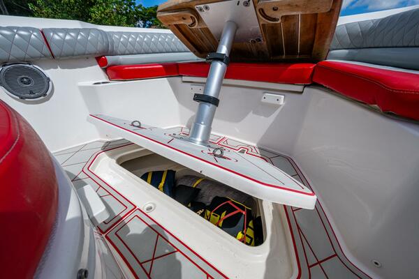 - Forward island deck seating with drink holders (2), bolsters, and removable cushions