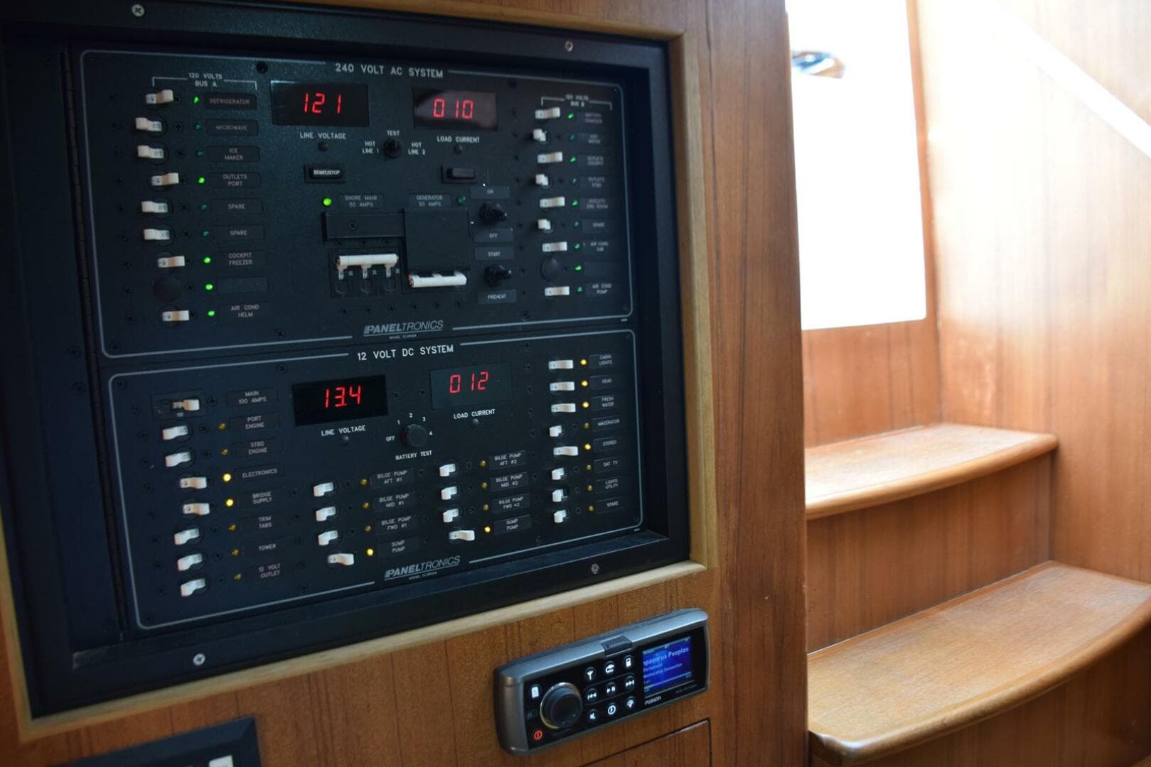 - Paneltronics 220V AC and 12V DC Main breaker panels with digital Line Voltage and Load Current displays on each