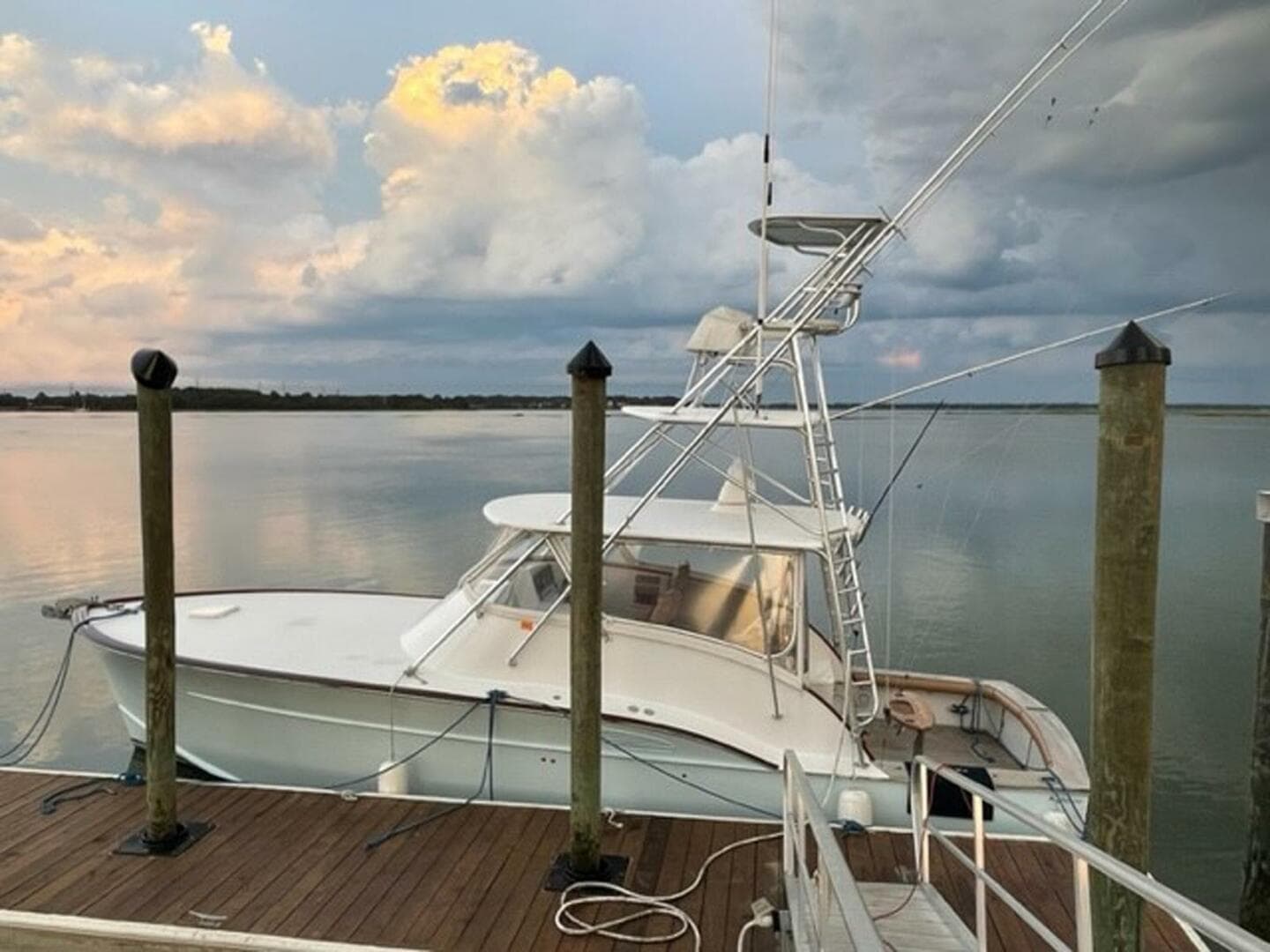 The finished project delivered a modern, stylish, and high-quality interior and bridge deck on a thoroughly refinished Classic Carolina hull. The first impression factor was raised dramatically with refinishing of the teak transom, teak coverboards (which were both new in '06), and the addition of a finely fitted and varnished teak helm pod. She also has a faux finished teak toe rail and a varnished bridge deck cap rail. Accented by varnished teak ladderback Bluewater helm and companion chairs and a Bluewater teak rocket launcher. The hull is light blue with a navy blue boot stripe and light grey bottom paint. The hull has a sharp entry forward with a subtle Carolina Flair, at her transom a notable tumblehome, and a classic broken shearline with hull side engine room vents. Decks and deckhouse are white with teak decking on the cockpit and bridge-deck soles. The finished project left the boatyard in February of 2016 and has seen very light usage since. The boat presents well and will make its next owner proud.